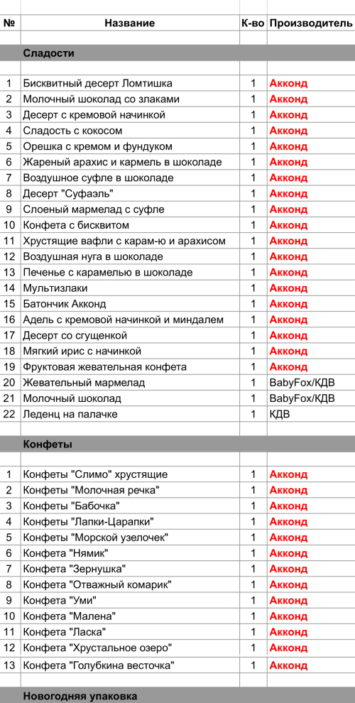 Бисквитный десерт Ломтишка (1 шт), Молочный шоколад со злаками (1 шт), Десерт с кремовой начинкой (1 шт), Сладость с кокосом (1 шт), Орешка с кремом и фундуком (1 шт), Жареный арахис и карамель в шоколаде (1 шт), Воздушное суфле в шоколаде (1 шт), Десерт "Суфаэль" (1 шт), Слоеный мармелад с суфле (1 шт), Конфета с бисквитом (1 шт), Хрустящие вафли с карам-ю и арахисом (1 шт), Воздушная нуга в шоколаде (1 шт), Печенье с карамелью в шоколаде (1 шт), Мультизлаки (1 шт), Батончик Акконд (1 шт), Адель с кремовой начинкой и миндалем (1 шт), Десерт со сгущенкой (1 шт), Мягкий ирис с начинкой (1 шт), Фруктовая жевательная конфета (1 шт), Конфеты "Слимо" хрустящие (1 шт), Конфеты "Молочная речка" (1 шт), Конфеты "Бабочка" (1 шт), Конфеты "Лапки-Царапки" (1 шт),Конфеты "Морской узелочек" (1 шт), Конфета "Нямик" (1 шт), Конфета "Зернушка" (1 шт), Конфета "Отважный комарик" (1 шт), Конфета "Уми" (1 шт), Конфета "Малена" (1 шт),Конфета "Ласка" (1 шт), Конфета "Хрустальное озеро" (1 шт), Конфета "Голубкина весточка" (1 шт)